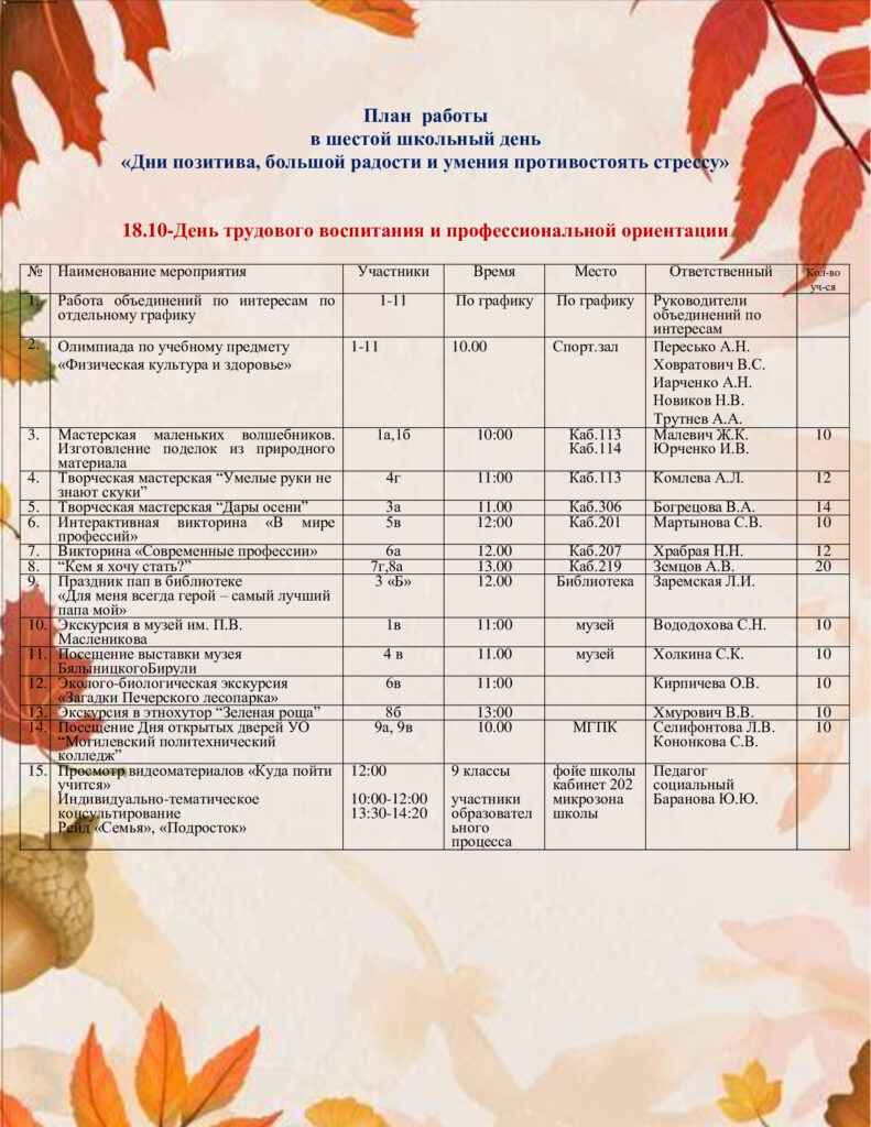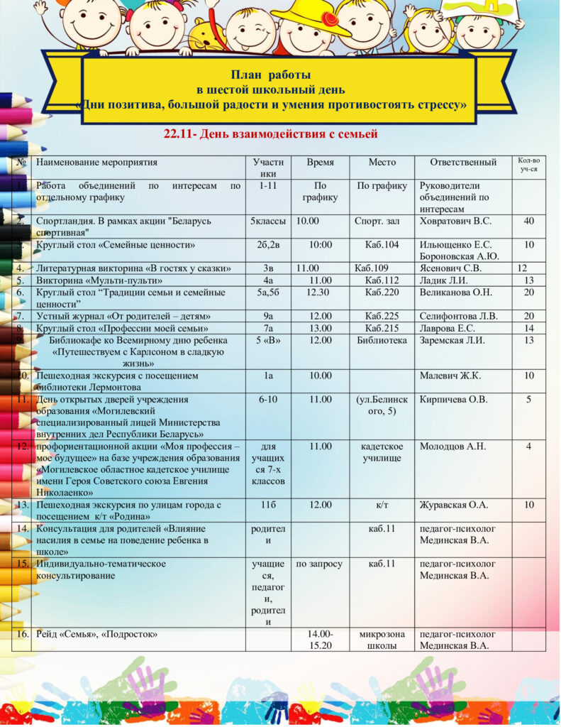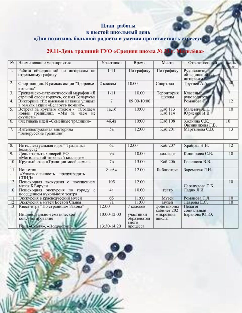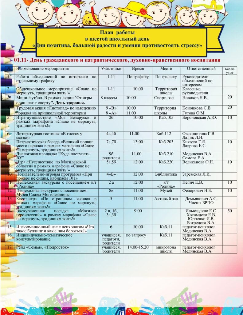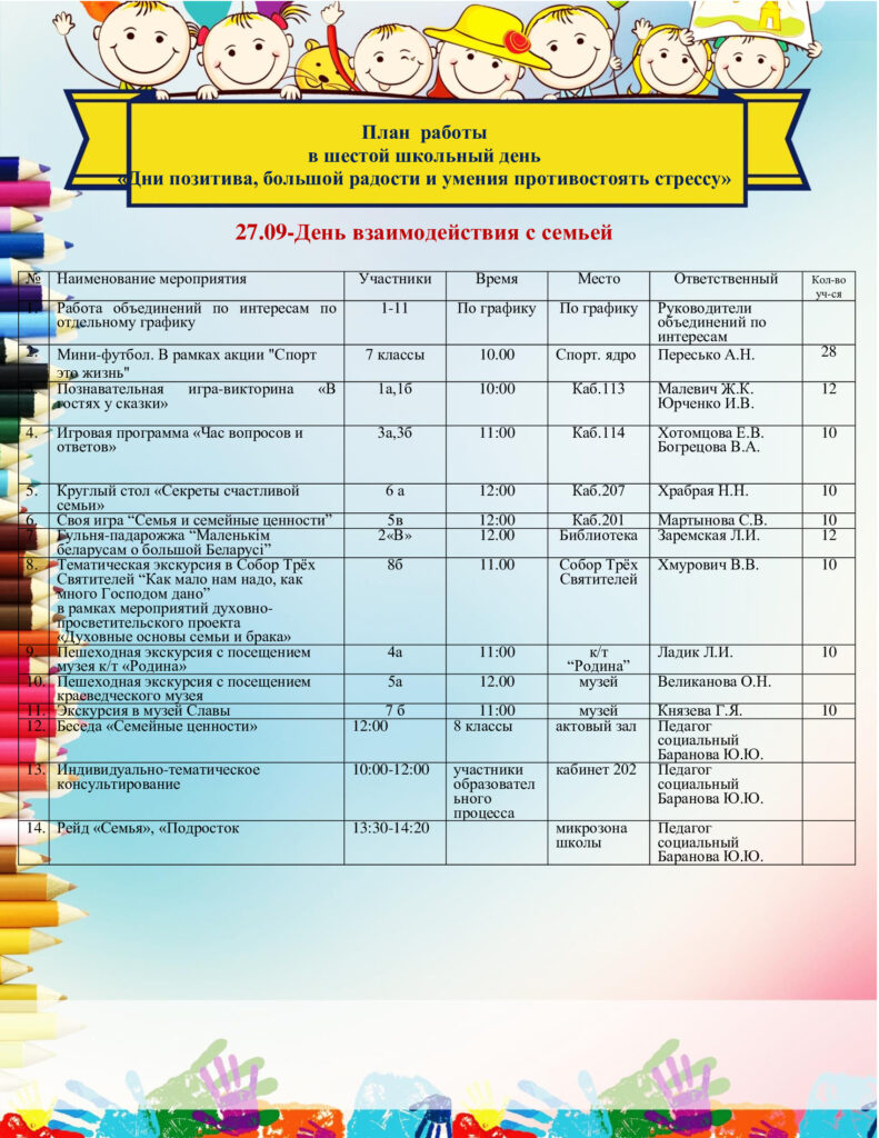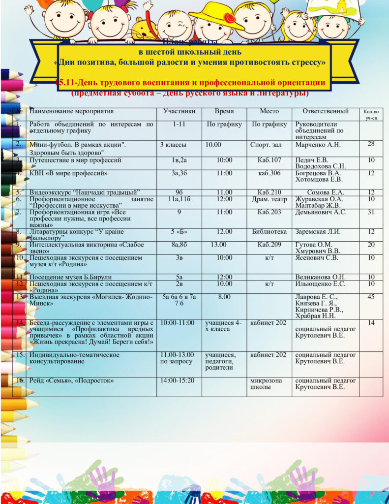 Суббота — это день интересных встреч и полезных занятий, предоставляющий дополнительные возможности для развития и социализации. Мы приглашаем всех к активному участию!Шестой день недели является важной частью образовательной системы и включает в себя задачи по организации содержательного досуга, сохранению здоровья, пропаганде здорового образа жизни и развитию творческих способностей детей. В этот день ученикам и их родителям предлагаются разнообразные мероприятия, направленные на укрепление физического и морального здоровья, интеллектуальное развитие и личностный рост. Приоритетом в воспитательной работе становятся спортивные и физкультурные мероприятия, а также трудовое воспитание. Важную роль играют детские молодежные организации, такие как «БРПО» и «БРСМ», которые вовлекают детей в социально значимую деятельность.