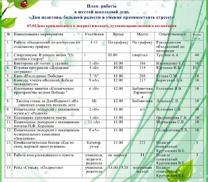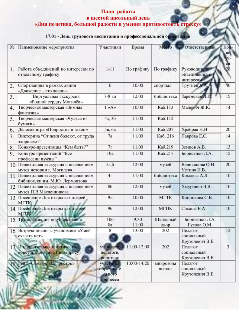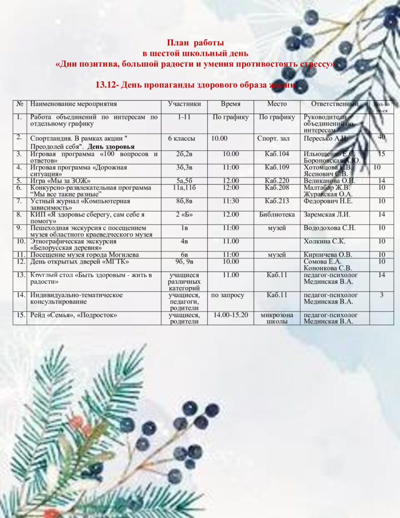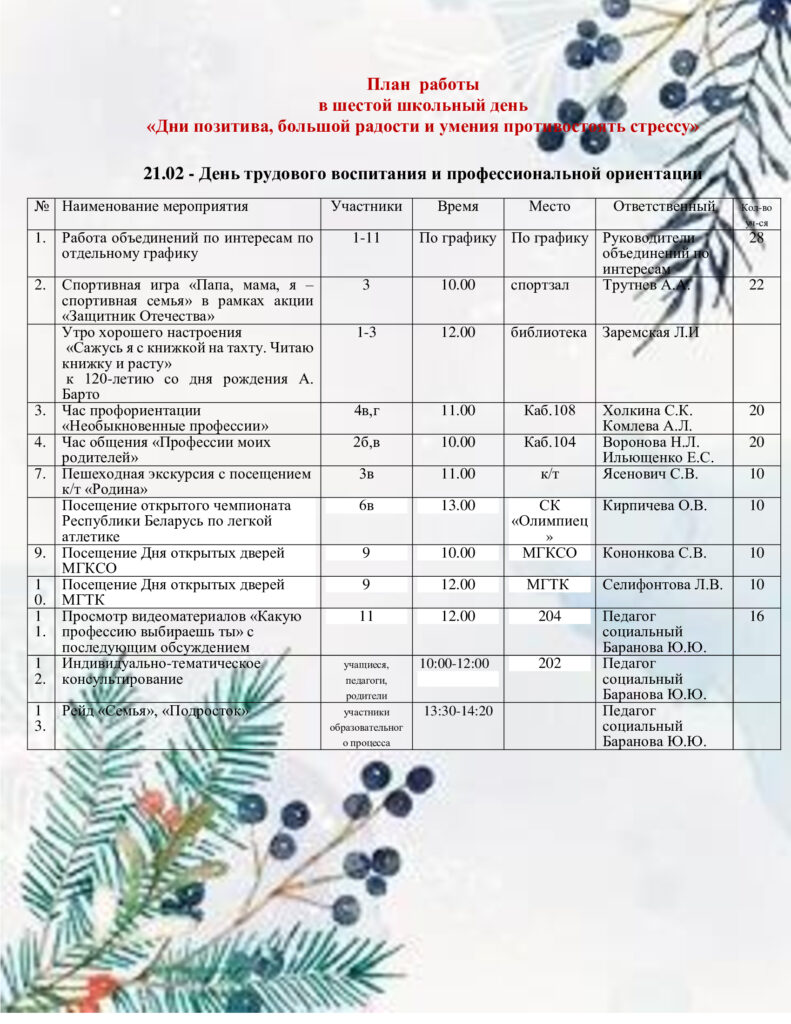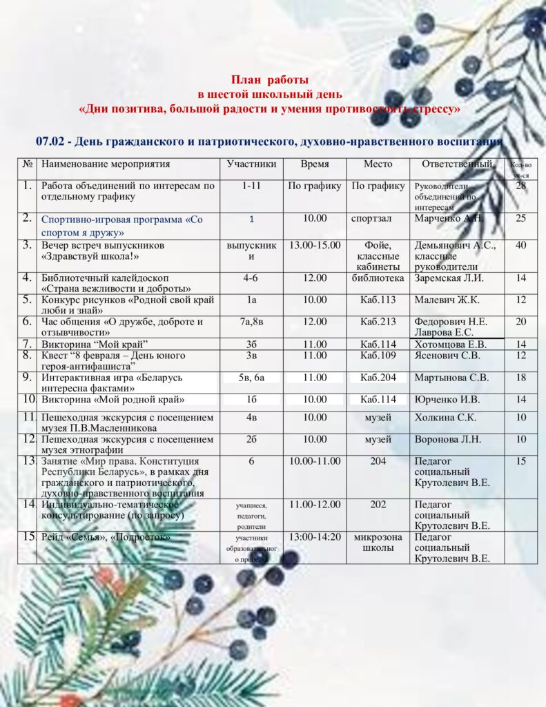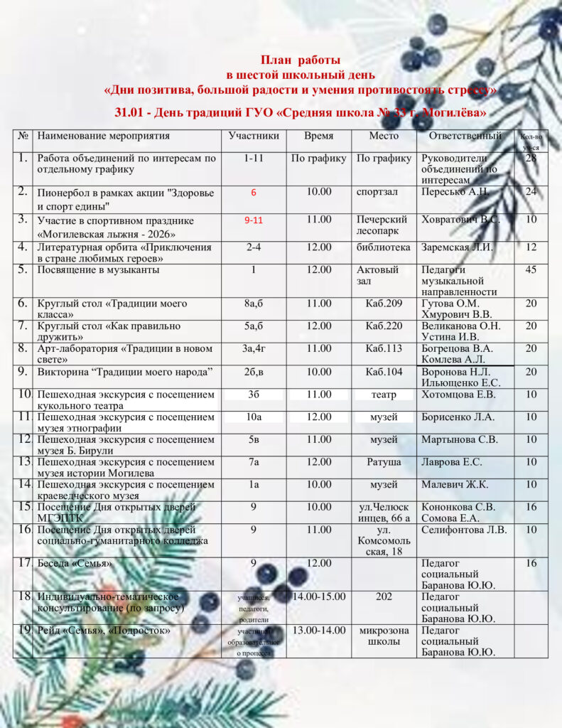 Суббота — это день интересных встреч и полезных занятий, предоставляющий дополнительные возможности для развития и социализации. Мы приглашаем всех к активному участию!Шестой день недели является важной частью образовательной системы и включает в себя задачи по организации содержательного досуга, сохранению здоровья, пропаганде здорового образа жизни и развитию творческих способностей детей. В этот день ученикам и их родителям предлагаются разнообразные мероприятия, направленные на укрепление физического и морального здоровья, интеллектуальное развитие и личностный рост. Приоритетом в воспитательной работе становятся спортивные и физкультурные мероприятия, а также трудовое воспитание. Важную роль играют детские молодежные организации, такие как «БРПО» и «БРСМ», которые вовлекают детей в социально значимую деятельность.