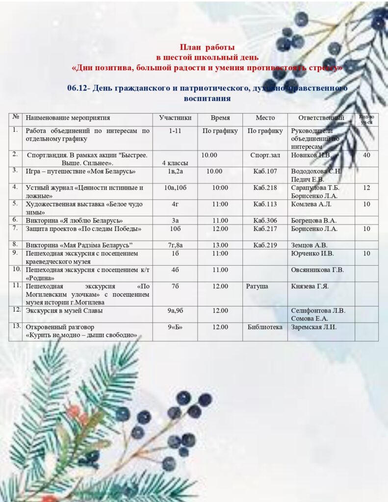 Система работы школы в шестой день предлагает широкий спектр форм организации досуга и творчества, соответствующих Концепции и Программе воспитания детей и молодежи в Республике Беларусь.