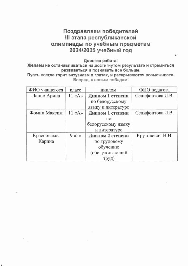| Красновская Карина | 10«А» | 1 степени по учебному предмету «Трудовое обучение» | Крутолевич Н.Н. |