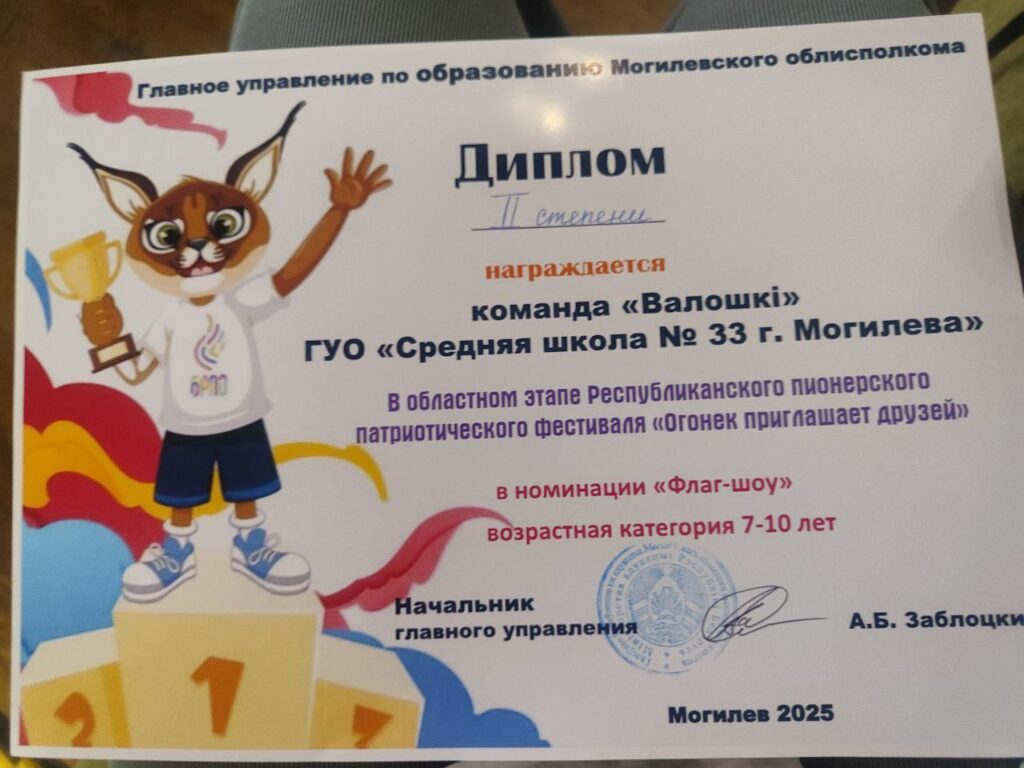 22 апреля в ГУДО «Могилевский областной центр творчества» состоялся областной этап конкурса «Флаг-шоу» в рамках Республиканского пионерского патриотического фестиваля «Огонёк приглашает друзей», в котором приняла участие и творческая команда учащихся нашей школы.