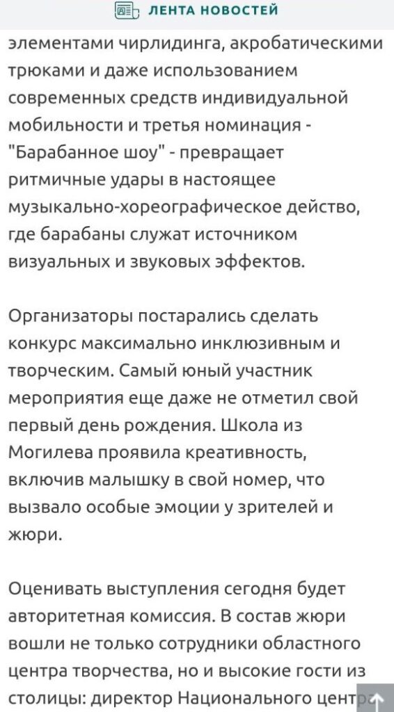 Искренне и от всего сердца поздравляем наш хореографический состав, который принимал участие в областном этапе III Республиканского смотра-конкурса «Сэрцам адданыя роднай зямлi», приуроченный к предстоящему Дню Государственного флага, Государственного герба и Государственного гимна Республики Беларусь, которые в номинации «Флаг-шоу» получили диплом 3 степени. После отбора по итогам заочного тура право продемонстрировать свое мастерство в очном финале получили 26 команд, среди которых была и наша школа, объединивших свыше 800 участников. География участников охватывала практически все районы области. Но и среди такого количества участников СМИ смогли выделить наших участников, прописав в своей статье о данном конкурсе.